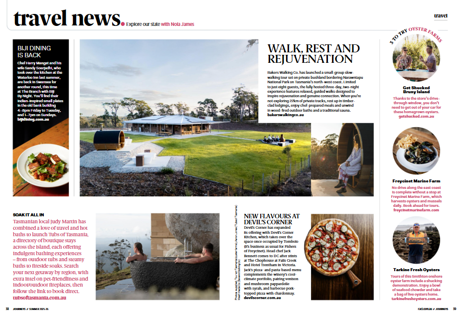 Our signature three-day / two-night walking retreat. Stay at a lodge with a small group of 4-9 and enjoy open air baths, sauna, gourmet meals and Tasmanian guides showing you flora and fauna.
